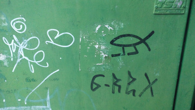 Прије неголи су украјинске регистрације запљуснуле Приморје, око је, у мору графита који постоје посвуда, могло да опази и стилизовану рибу са ногама. Тек ту и тамо стајао је и потпис: Exodus social slub.