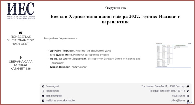 У атмосфери спољних фактора нестабилности (пандемије корона вируса, рата у Украјини), као и унутрашњих тензија у самој држави, 2. октобра 2022. одржани су општи избори у Босни и Херцеговини. Имајући у виду њихов значај за целокупни регион, Институт за европске студије организовао је 10. октобра 2022. округли сто на тему изазова и перспектива по завршетку наведених избора. На округлом столу су говорили проф. др Златко Хаџидедић (Универзитет Sarajevo School of Science and Technology/Центар за студије национализма), мср Марко Луцовић (политиколог), др Рајко Петровић (Институт за европске студије) и мср Душан Илић (Институт за европске студије).