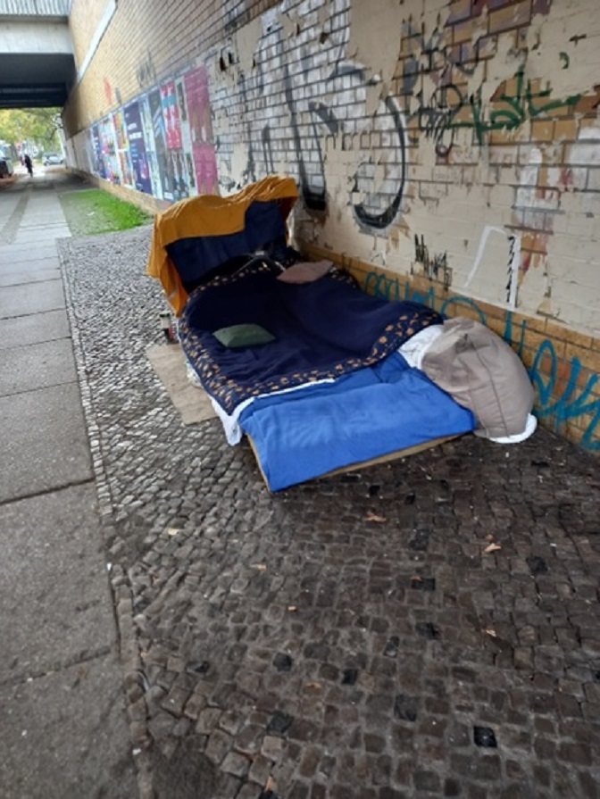 У истој тој улици може се видети кревет. Овде, дакле, испод моста, спавају бескућници. Овакве „смештаје“ становници Берлина могу да виде готово испод свакога моста, али у централним улицама Берлина. Сада, крајем новембра, ноћу су температуре и до минус седам степени. Када овакав смештај човек „ужива“ лети, то можда изгледа „кул“, но данас провести ноћ у оваквим условима, чини ми се, није нимало романтично.