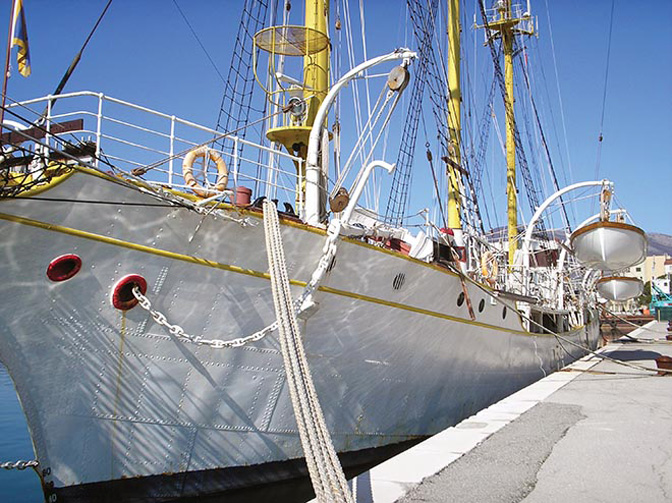 Школски брод „Јадран“ (1933), детаљ. Године 2018, пред 15-дневну обуку на мору 42 студента которског Факултета за поморство, заплијењено је преко 55 килограма кокаина, чиме је поморству Боке Которске, кад и образовном кадру нанесена увреда над увредама (Фото: Н. М.)