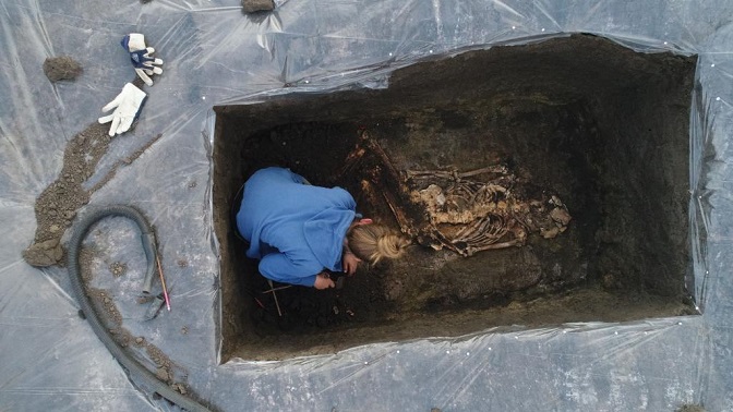 „Гробови нису били спектакуларно опремљени, али смо примијетили црвену боју на појединим костима, усљед коришћења окера“, рекао је један од руководилаца ископавања др Пјотр Влодарчак из Института за археологију и етнологију Пољске академије наука. Према његовим ријечима тада је то била „света боја“ коришћена приликом ритуала сахране. Остаци су припадали високом човјеку, висине преко метар и осамдесет сантиметара.