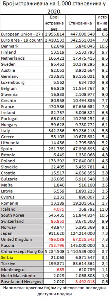 Србија је још увек испред Турске по броју истраживача, али неће бити још дуго. Мањи релативни број истраживача од Србије имају још Црна Гора, С. Македонија и Босна и Херцеговина (без података за Албанију). Кина и Русија су испод просека за ЕУ, али за разлику од руске стагнације Кина брзо претиче чланице ЕУ те је испред Малте и Летоније а иза Бугарске и Хрватске које је већ вероватно претекла у 2021. или у 2022.