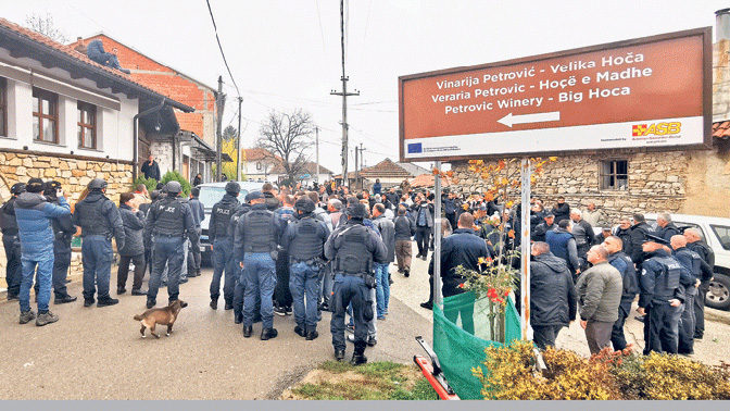 Неколико полицајаца јавља надређенима какво је стање испред куће Петровића и проверава ко смо. „Одакле си ти?”, пита број 4034. „Ја сам одавде, а одакле си ти?” „Ја сам из Ратковца.” „О комшија, па ти сигурно знаш Ђиновиће?” „Знам, Божу, Милоша…” „А сећаш ли се Душка?” Код њега је застао и ућутао: „Не богами…” Душко је отет и убијен 1999. године и једна је од 84 српске жртве овог краја. Институције које одузимају вино једној од најугледнијих породица довеле су јуче њихове комшије да се обрачунавају и припреме упад у кућу Петровића осумњичених за нелегалну производњу алкохолних пића. Мештани се окупљају, специјалци са дугим цевима излазе на пут поред лимених контејнера, примиче се цистерна којом ће царина запленити вино. Поред њих стоји мурал Бранислава Нушића са реченицом коју је записао док је у Отоманској империји био српски конзул у Приштини: „Срби Велике Хоче, највише су се одржали против зулума, стога се у целој Подрими сматрају као најодважнији.”