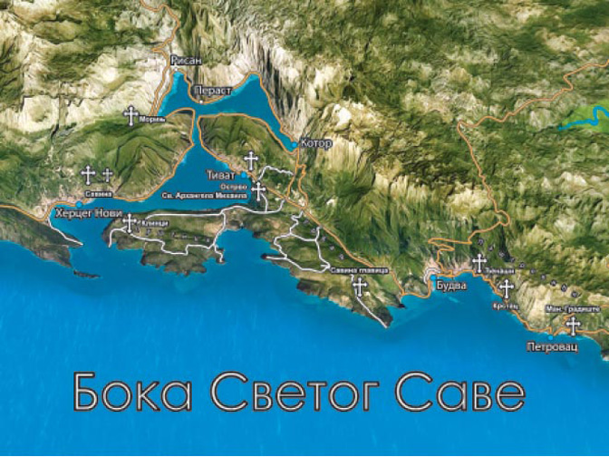 Изузимајући Хиландар, култ Светог Саве развијенији је у Боки него у ма којем крају гдје живе Срби. Осам храмова Светог Саве, и манастир Савина, и Михољска превлака – некадашње средиште Зетске епископије (Мапа: Стефан Вукићевић)