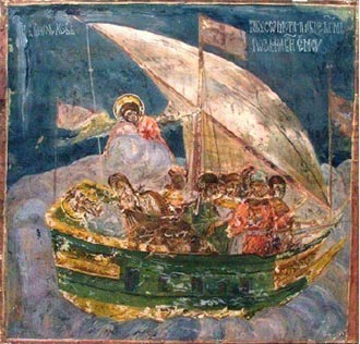 Свети Сава путује лађом у Јерусалим – фреска из манастира Хиландар: Свети Сава је на оба путовања у Јерусалим, 1229. и 1234. г. испловио из Боке
