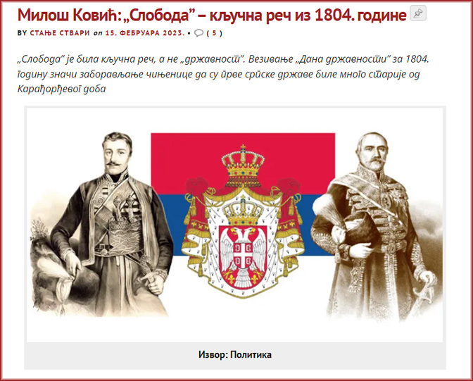 Ковић је апсолутно у праву, али је веома важан још један моменат на који Ковић вероватно није ни имао намеру да укаже. Ради се о томе да је спајање ова два празника у један прерасло у опште багателисање устанка у Орашцу, који је био историјска прекретница величине Монт-Евереста, на рачун првог Устава који јесте био значајан историјски, али он се мора посебно и другачије вредновати. Ово је тековина владавине жутаћа коју је свим срцем и свим снагама преузео Вучић. Као лидер странке без икакве идеологије, без ичега оригиналног, свог, визионарског, и као што је и све остало преузео од жутог предузећа и замаскирао у тобожњи „реални национализам”, и ову идеју он ревносно примењује, свестрано развија и дограђује.