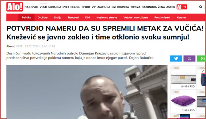 Судија Вишег суда у Београду Ксенија Марић одредила је овог петка притвор до 30 дана уреднику портала Србин.инфо Дејану Златановићу. Како је агенцији Бета казао адвокат Марко Пушица, притвор је одређен и вођи Народних патрола Дамњану Кнежевићу.