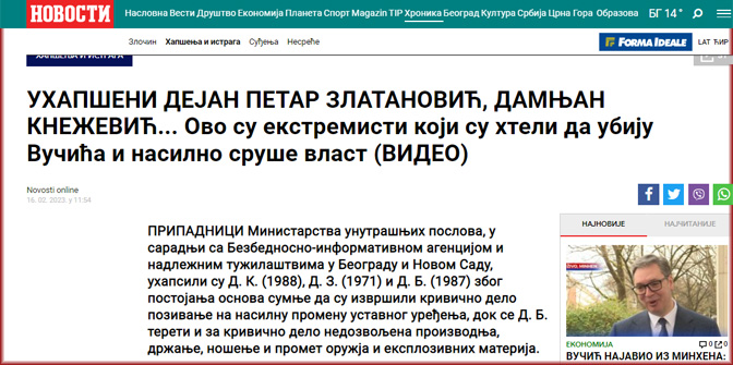 Златановић и Кнежевић су ухапшени у среду, 15. фебруара, након протеста грађана испред Председништва Србије, због постојања основа сумње да су извршили кривично дело Позивање на насилну промену уставног уређења.