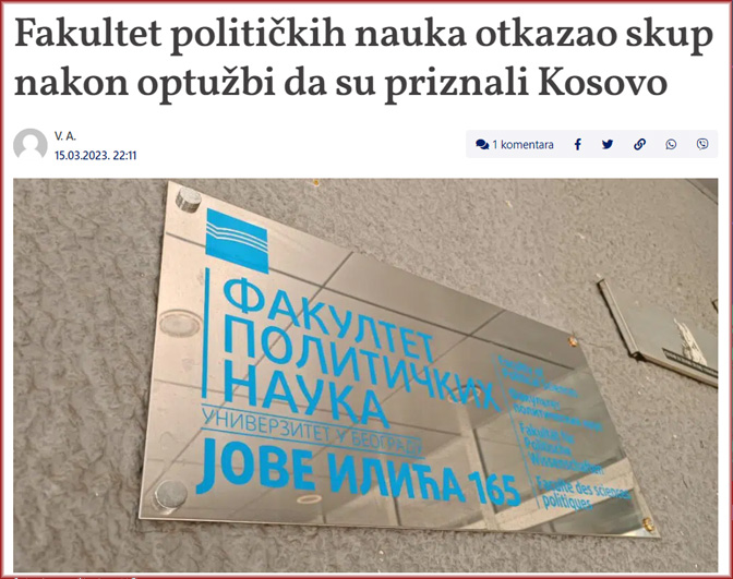 Шта рећи о наглашено емотивним изливима забринутости појединих професора овог факултета због инцидента са плакатима, о њиховом залагања за одбрану права на слободу мишљења, размену научног знања и толеранцију? Онај ко иоле познаје владајућу атмосферу политичке коректности на Факултету политичких наука, само ће се насмејати на то, присећајући се како су се дотичне колеге односиле према својим неистомишљеницима, са колико су се страсти неки од њих ангажовали у спречавању израде докторских радова на по њима политички неподобне теме.[1] Што се тиче најпре пристајања на тзв. научну размену, а онда и планираног учешћа на округлом столу троје наставника, као и декана Факултета политичких наука, све то подсећа на спремност неких наших глумаца да прихвате улоге Срба негативаца у антисрпским филмовима. Као што је мотив тих глумаца углавном био новац, очекивање међународних филмских награда, евентуална препорука за улоге у неким значајнијим западним филмским остварењима, тако и мотив наших наставника није био чисто научне природе, као што покушавају да нас увере њихови бранитељи. Да ли би неко заиста поверовао да неки наш лекар има жељу да иде на стручно усавршавање на приштински Медицински факултет? Разлог да се тамо нађе или је позамашна новчана сума или очекивање да тај неочекивани одлазак буде улазница за позив на сарадњу са неком значајном западном медицинском установом. Није тешко увидети да је замисао о тзв. научној радионици потекла од западних структура којима је стало да се убрза процес признавања сецесије Косова, а на тај позив су се одазвали они којима је лична корист важнија од интереса своје земље.