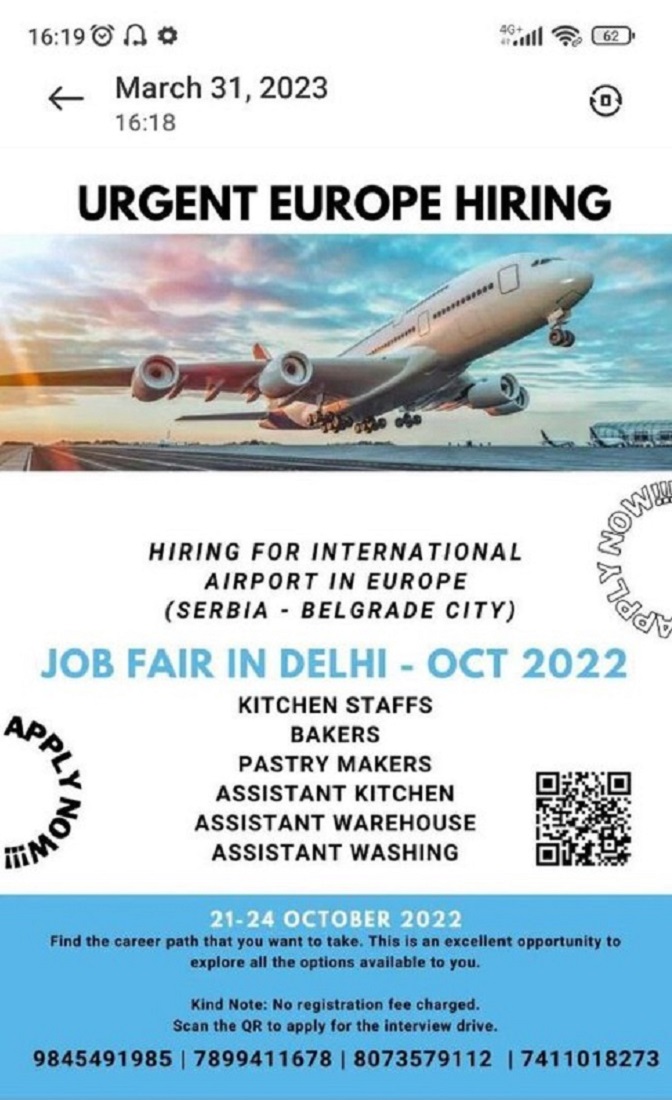 Оглас предузећа Аеродром кетеринг Београд за запошљавање радника из Индије (Извор: РТ Балкан)