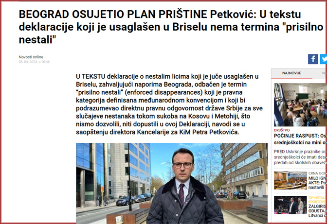 Председник Комисије за нестале Владе Косова Андин Хоти огласио се поводом договореног текста Декларације о несталима, на јучерашњој рунди дијалога у Бриселу, наводећи „да ће Србија морати да отвори архиву и презентује тајна документа о присилно несталим лицима“.