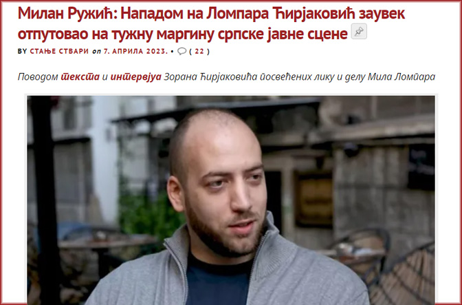 Поводом текста М. Ружића „Нападом на Ломпара Ћирјаковић заувек отпутовао на тужну маргину српске јавне сцене“, пренетом и на „Стању ствари“
