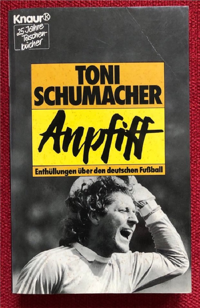Насловница књиге Почетни звиждук из 1987. године тадашњег капитена немачке фудбалске репрезентације голмана Тонија Шумахера, у којој је говорио о тамној страни спорта у Немачкој, због које је, без икаквих провера у њој објављених тврдњи, избачен из репрезентације и Бундеслиге