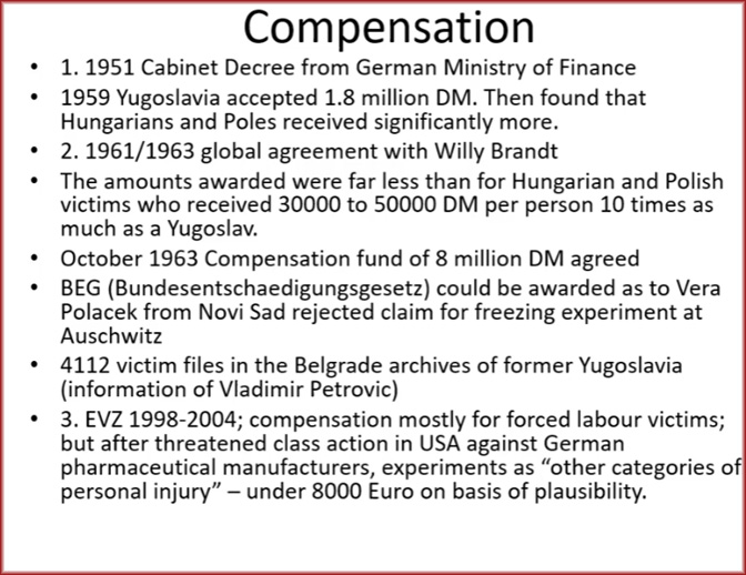 По завршетку Другог светског рата, а на конто одлуке немачког савезног канцелара Конрада Аденауера о послератној материјалној компензацији жртава присилних медицинских експеримената, започет је процес прикупљања доказа о броју жртва и њиховој националности. На почетку овог процеса, сматрало се да не постоји велики број преживелих и да су присилни медицински експерименти били „псеудо-медицински“ због тога што су били мотивисани расном идеологијом. Регистровани су само случајеви жртава медицинских експеримената, а не и злостављања у концентрационим логорима. Међутим, однос немачких власти се променио од доласка савезног канцелара Вилија Бранта и примене Остполитике, имајући у виду другачији однос немачких власти према насилном историјском наслеђу. У том периоду, склопљени су одређени међудржавни споразуми који су регулисали питање новчане и медицинске компензације жртава нехуманих и присилних медицинских експеримената у концентрационим логорима.