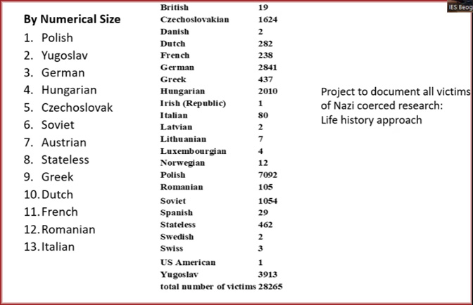 На основу анализе засноване на архивским документима и одређеним медицинским доказима из медицинских одељака концентрационих логора, проф. Вајндлинг износи податак да је укупан број жртава нацистичких медицинских експеримената у поменутом периоду износио 29290. После жртава пољске националности (7092), највећи број жртава нацистичких медицинских експеримената био је југословенске националности (3913), потом немачке (2841), мађарске (2010) и чехословачке (1624). Од укупног броја жртава, 4400 чинили су припадници јеврејске националности, док је најмање 11454 жртава преживело. Међутим, препрека у доласку до истраживачких налаза јесте у томе што је комплексно разлучити жртве присилних медицинских експеримената од жртви над којима је примењивано насиље, присилни рад и злостављање.