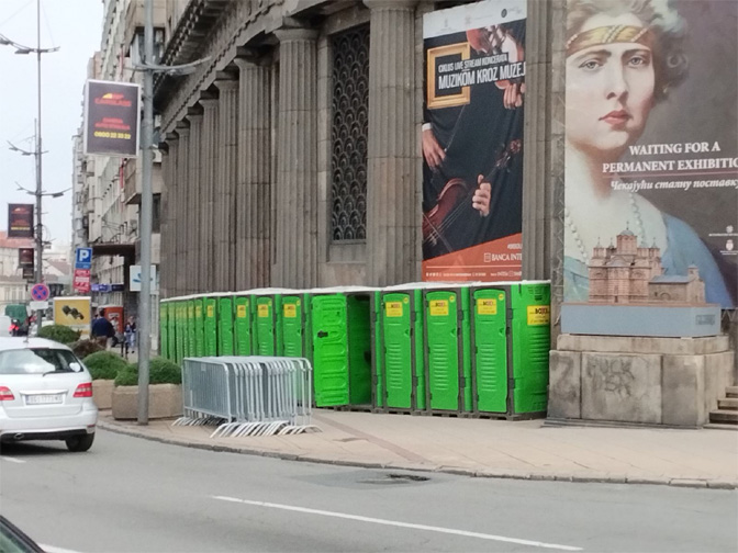 Припреме за СНС митинг „Србија наде“: Покретни тоалети испред Музеја историје Србије (Фото: Стање ствари)