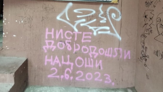 Ћирилични графит „Нисте добродошли нацоши 2. 6. 2023“ на клубу Фест у Земуну пред концерт српске групе Визант из Никшића (Фото: Новости/Приватна архива)