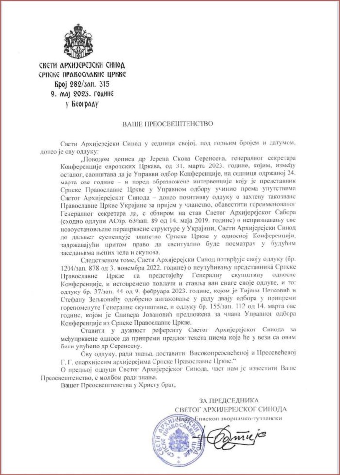 „Поводом дописа др Јерена Скова Серенсена, генералног секретара Конференције европских Цркава, од 31. марта 2023. године, којим, између осталог, саопштава да је Управни одбор Конференције, на седници одржаној 24. марта ове године – и поред образложене интервенције коју је представник Српске Православне Цркве у Управном одбору учинио према упутствима Светог Архијерејског Синода – донео позитивну одлуку о захтеву такозване Православне Цркве Украјине за пријем у чланство, обавестити гореименованог Генералног секретара да, с обзиром на став Светог Архијерејског Сабора (сходно одлуци АСбр. 63/зап. 89 од 14. маја 2019. године) о непризнавању ове новоустановљене парацрквене структуре у Украјини, Свети Архијерејски Синод до даљњег суспендује чланство Српске Цркве у односној Конференцији, задржавајући притом право да евентуално буде посматрач у будућим заседањима њених тела и скупова.