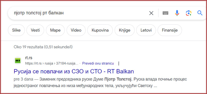 Напомена Стања ствари: Вест, првобитно објављена на РТ Балкан 19. 6. 2023, касније је повучена с тог портала. Претрага на Гуглу показује да су остали „трагови“: