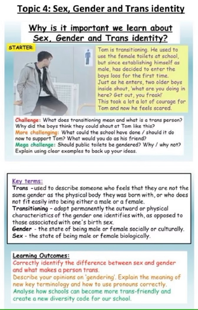 Многи наставници индоктринишу дјецу научно неутемељеним тврдњама о биолошком полу, представљајући пол као неодређен и ширећи причу да се људи могу родити у погрешном тијелу. На слици наставни план из школе у Дорсету (Енглеска) за ђаке десетог разреда, узраста од 14 до 15 година (Фото: Дејли мејл)