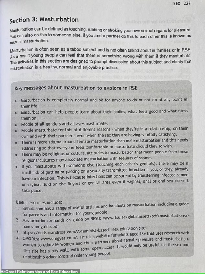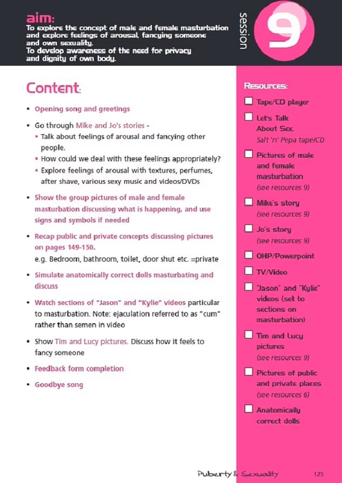 „Награђивани“ наставни програм за деветогодишњу дјецу са сметњама у учењу направљен прије него је предмет Везе и сексуално образовање постао обавезан био је подједнако експлицитан. План за један од часова предвиђао је да учитељи „разреду покажу слике мушке и женске мастурбације“ и „симулацију мастурбације употребом анатомски коректних лутака“ (Фото: Дејли мејл)