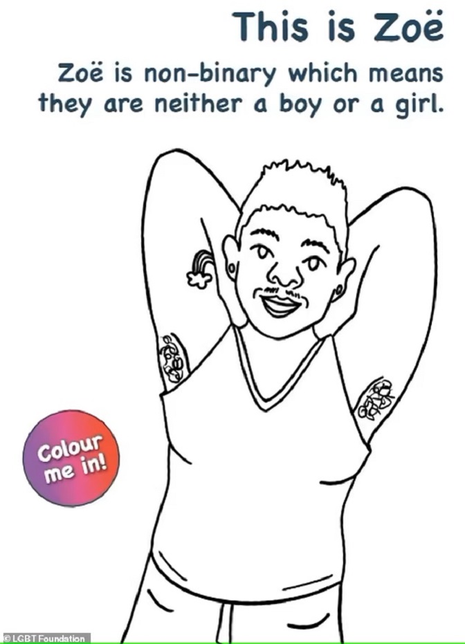 Бојанка за петогодишњу дјецу у којој дјеца треба да боје Зое, која је „небинарна“, што према наводима у књизи значи да „није ни дјечак ни дјевојчица“ (Фото: Дејли мејл)