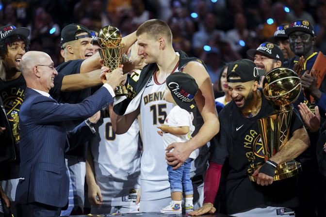 Никола Јокић са ћеркицом у наручју прима пехар у финалу НБА (Фото: Танјуг/АП)
