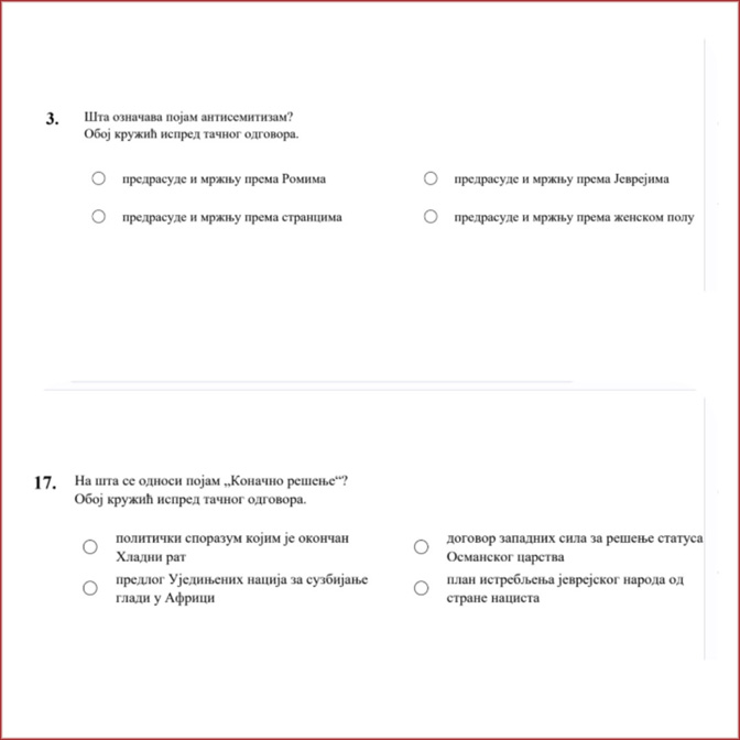 На овогодишњем Завршном тесту из историје наши ученици имали су питање о антисемитизму, имали су питање и о злочинима над Јеврејима, али ниједно питање о Јасеновцу и злочинима над Србима.