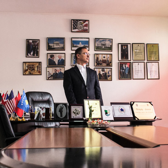 Агим Реџепи, председник Удружења пријатеља Америке на Косову, позира за израду портрета у својој канцеларији у Приштини