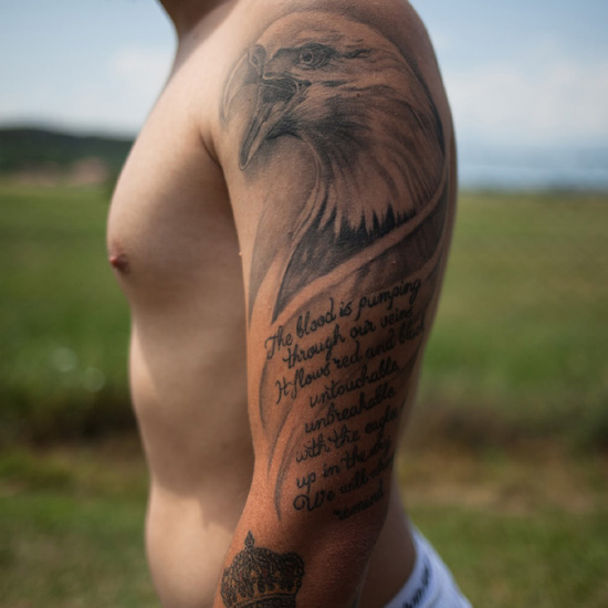Арлинд Баша показује истетовираног орла са стиховима на енглеском језику који се односе на косовско-албански национални идентитет