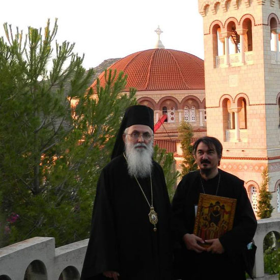 Прота Ненад Андрић (десно) са поч. владиком Милутином на Егини