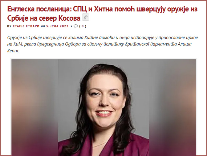 Посланица британског парламента Алиша Кернс је пре неки дан, без икаквих доказа, оптужила Српску цркву да држи оружје у својим храмовима на Косову и Метохији. Тамо га, наводно, довозе из ‘велике’ Србије колима хитне помоћи.