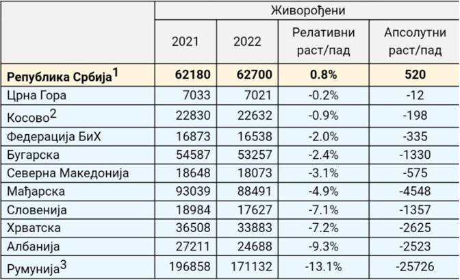 Србија је, према овим подацима, једина у региону успела да оствари већи број живорођених у односу на прошлу годину, односно прекине тенденцију све мањег броја рођених из године у годину.