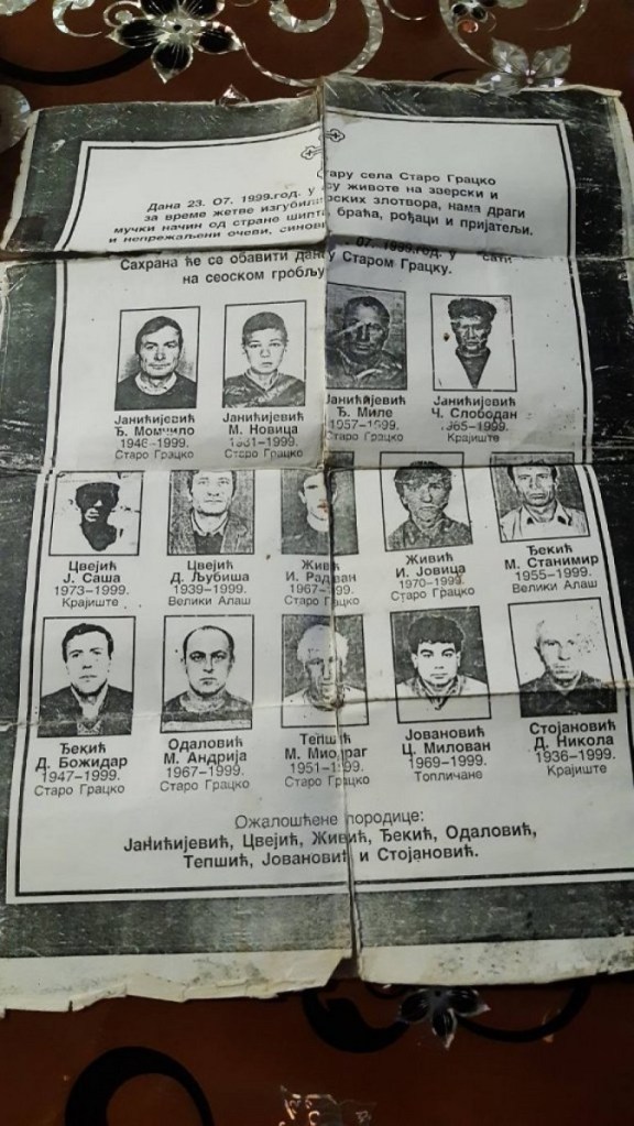 Никако не могу прихватити чињенице да злочинци овог гнусног, нечувеног масакра над 14 жетеоца, недужних, цивилних припадницика српског народа, у вечерњим сатима 23. јула 1999. г. у Старом Грацком, код Липљана, на КиМ нису познати, нити су кажњени!?