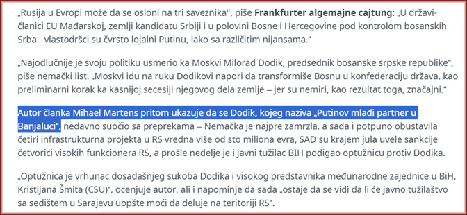 Руководство Републике Српске зато мора пажљиво да промисли опције које се пред њиме налазе. У питању није само физички интегритет председника, што би било довољан разлог за предузимање мера, него нешто више од тога, опстанак Републике. Милораду Додику прети затвор, али Републици Српској прете оружани напад и уништење.