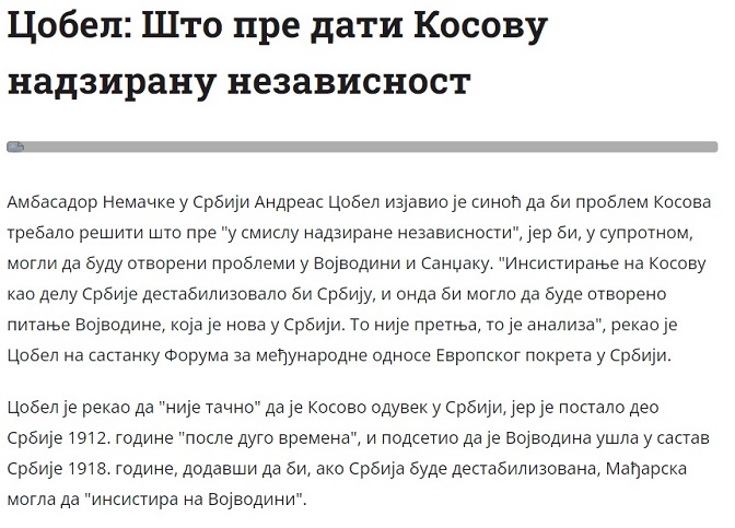 Дипломатија се много променила у последње време. Само се у језику задржао израз „дипломатски“, да би се рекло како неко нешто саопштава одмерено, обазриво, пажљиво и бираним изразима. Заборавили смо ову изјаву амбасадора Цобела, која показује шта Немци већ дуго мисле и планирају. и све се мање устручавају да отворено прете и уцењују. Не либећи се, Цобел позива Мађарску и подстиче аспирације на Војводину. Све дипломатски! Наравно, Немци су познати по својом деликатном, пажљивом и нежном понашању према другима, а нарочито некима. То се неће никад заборавити, само су они изгледа почели да заборављају.