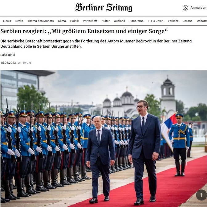 „С највећим ужасавањем и извесном забринутошћу прочитали смо чланак ,Балкану је потребна Немачка као сила за регулисање, доминација Србије мора бити сломљенаʻ од 13. августа у онлајн издању Берлинер цајтунга. Уз дужно поштовање слободе штампе и слободе изражавања, посебно за либералне новине попут Берлинер цајтунга, морамо признати да су изјаве и захтеви у овом чланку, који се односе на стратегију стару више од сто година и која је довела до првог великог уништења Европе у прошлом веку, са милионима жртава, само изазвале страх и забринутост у нама“, наводи се у одговору амбасаде Берлинер цајтунгу.