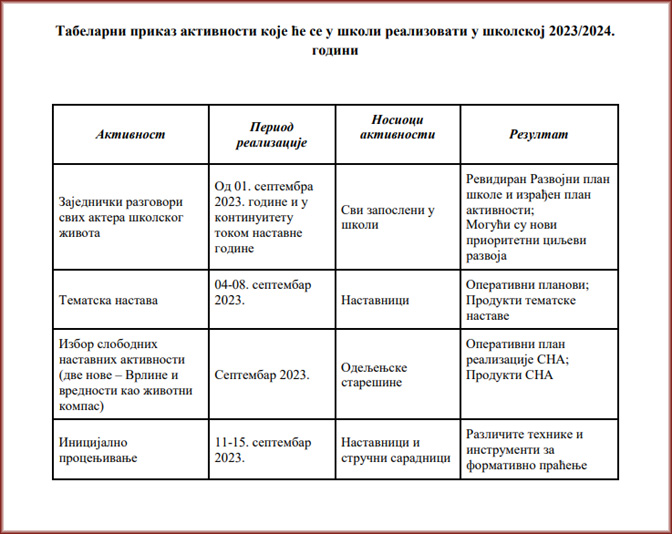 - Током прве наставне недеље (4-8.9.2023) организује се тематска настава, са радионицама и другим активностима усмереним ка неговању емпатије, вредностима међусобног поштовања, сарадње и солидарности, уз уважавање различитости;