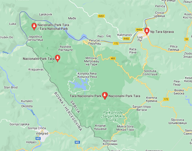 Национални парк „Тара” се простире на 25.000 хектара. Налази се на крајњем западу Србије, између Вишеграда и Бајине Баште. Типично је шумско подручје, а по очуваности и разноврсности шумских екосистема, од којих су многи реликтног карактера, спада у најбогатија и највреднија шумска подручја Европе. Од заступљених 1.156 биљних врста, 76 су ендемичне, расту само овде. Посебну вредност и значај има Панчићева оморика, која је преживела последње ледено доба.