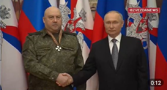 Председник Русије Владимир Путин одликује генерала Сергеја Суровикина орденом Светог Георгија 31. децембра 2022. (Извор: РТ Балкан)