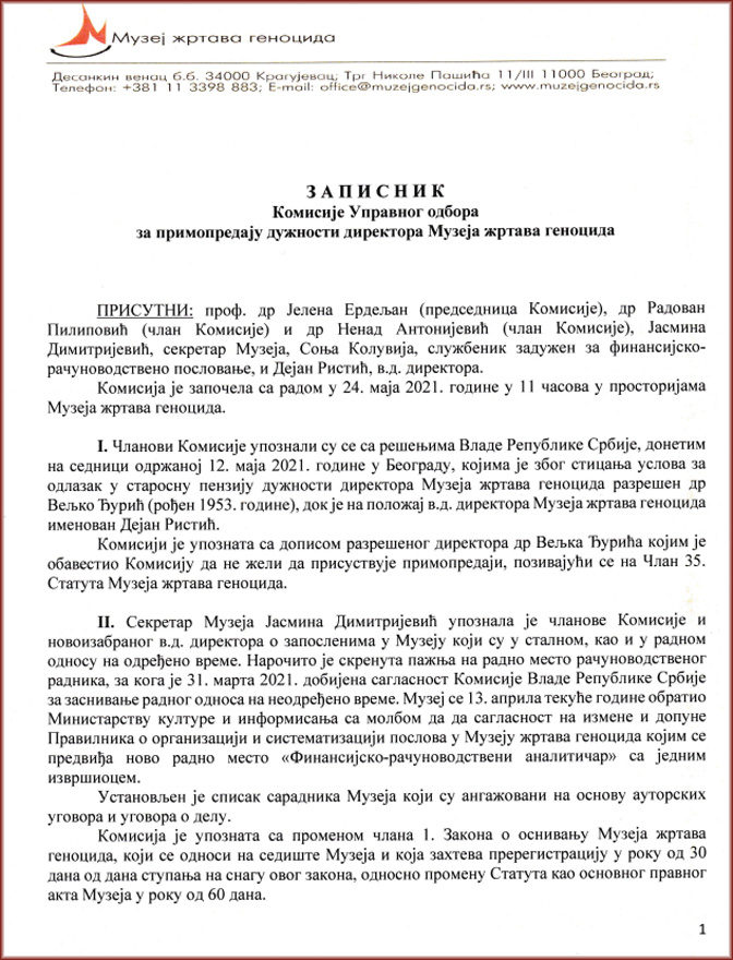 РИСТИЋ: Могући одговор на то питање одвео би нас на склиско и непоуздано поље претпоставки и нагађања. Уколико бих, међутим, на основу свог професионалног искуства покушао да понудим могући одговор онда би се он кретао у правцу тога да Србија и Српска по први пут након много година коначно јавно, одлучно, континуирано и синхронизовано делују на пољу културе сећања на српске жртве Другог светског рата, а посебно у сфери сећања на српске жртве геноцида почињеног над њима од стране НДХ. Такав, за многе неочекивани и нежељени, замајац у области културе сећања сам по себи и сасвим очекивано изазива снажне отпоре у оним срединама и друштвеним групама које деценијама негирају, минимизирају/преувеличавају и фалсификују историјску појаву страдања стотина хиљада српских цивила током Другог светског рата. И да не буде забуне. Многи неупућени ће као из топа рећи да такви отпори стижу понајпре из Загреба, Сарајева и других политичких центара. Ми, из Музеја жртава геноцида, указаћемо, међутим, да вешто прикривена, али зато веома реална опасност вреба и у самом Београду, Бањалуци и још неким српским градовима.