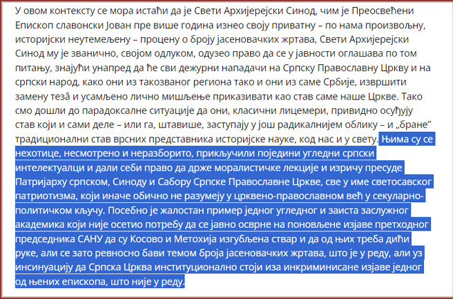 Не могу а да не упитам чланове Синода зашто нису на одређен начин, својим ауторитетом, приликом гласања у Народној скупштини о тзв. Смиљиној резолуцији, којом је требало да се одреди дан сећања на геноцид над Србима, Јеврејима и Ромима, тој иницијативи пружили подршку? Можда зато што је против тог захтева, иза којег нису стајали „класични лицемери” и tutti quanti, како се лепим српским језиком изразио Синод, била владајућа коалиција?