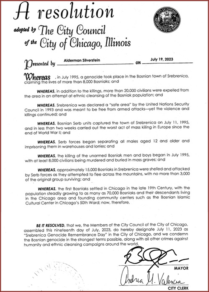 ODLUČENO da mi, članovi Gradskog vijeća grada Chikaga, okupljeni ovog devetnaestog dana jula 2023. godine, ovim 11. jula 2023. godine proglašavamo „Danom sjećanja na genocid u Srebrenici“ u gradu Chikagu, i najoštrije osuđujemo genocid u Bosni i Hercegovini zajedno sa svim drugim zločinima protiv čovječnosti i kampanjama etničkog čišćenja širom svijeta.“