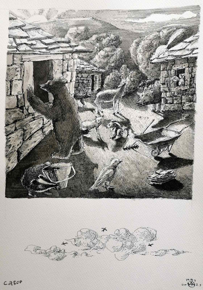 Скоро се смркло кад под стољетне букве на Брезовцу са свих страна почеше пристизати звијерови и као да је невидљива рука управљала њима, заузимали су своја мјеста између дебала, испунивши цијелу шуму да се убрзо ушатим главама лисица и јазаваца, вукова и чагљева краја није могло назријети. Зечеви и вјеверице, репати пухови и друга мања шумска чељад стадоше у први ред, и тако по величини вириле су радознале главе осталих, све до породица међеда. Изнад глава на гранама што су се лагано повијале стајао је птичји род, распоређен по врстама и величини.
