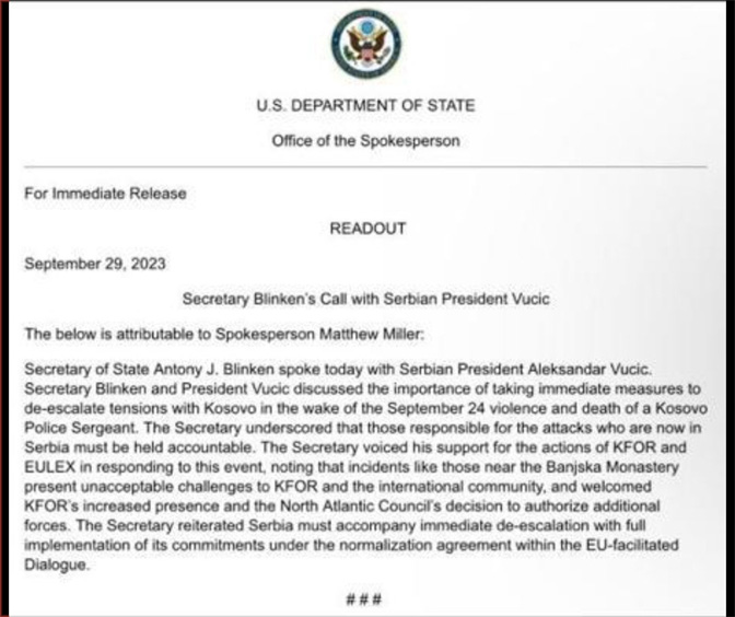 „Секретар Блинкен и председник Вучић разговарали су о значају предузимања хитних мера за деескалацију тензија са Косовом после насиља 24. септембра и смрти наредника Косовске полиције“, наводи се у саопштењу.
