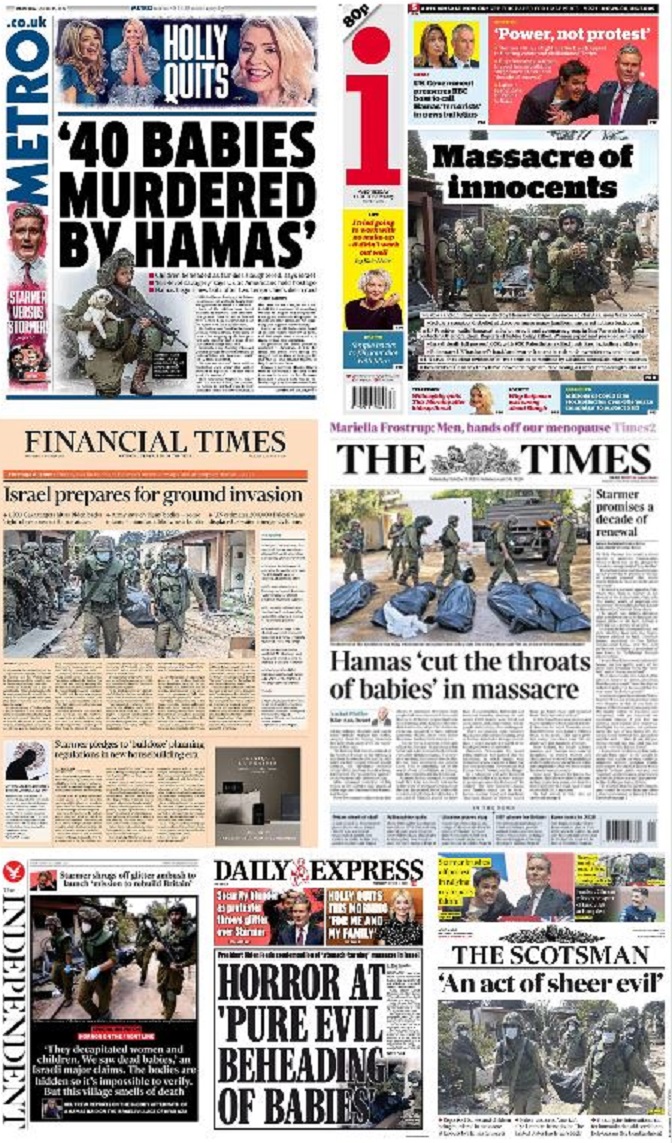 „Хамас убио 40 беба“, „Хамас пререзао гркљан бебама у масакру“, „Они су одсекли главе женама и деци“, „Чин апсолутног зла“, само су неки од наслова који су осванули на насловним страницама угледних медија попут Фајненшел тајмса, Индипендента или Тајмса.