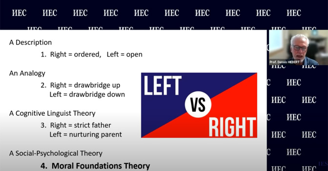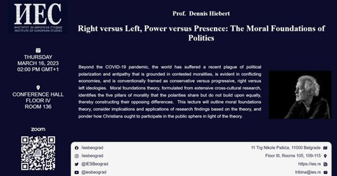 Институт за европске студије 16. марта 2023. године организовао је предавање „Десница vs. левица, моћ vs. присуство: морални темељи политике“ др Дениса Хиберта, некадашњег професора на Универзитету у Манитоби (Канада) и бившег председника Хришћанске социолошке асоцијације. Професор Хиберт познат је научној јавности као аутор књиге Рационалност, смерност и духовност у хришћанском животу (2020), али и по уредничкој позицији у међународном научном часопису Journal of Sociology and Christianity. Такође, др Денис Хиберт уредник је и зборника радова Међународни приручник за социологију и хришћанство (2023, у припреми угледне издавачке куће Routledge).