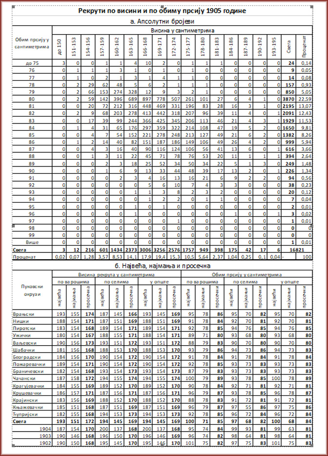 У Статистичком годишњаку Kраљевине Србије за 1905. (издатом у Државној Штампарији Краљевине Србије 1907. по цени од 10,50 динара и 10,50 frans) на страницама 714 и 715 дати су детаљни подаци о регрутима (тада рекрутима) према висини у сантиметрима и обиму груди, и по пуковским окрузима.