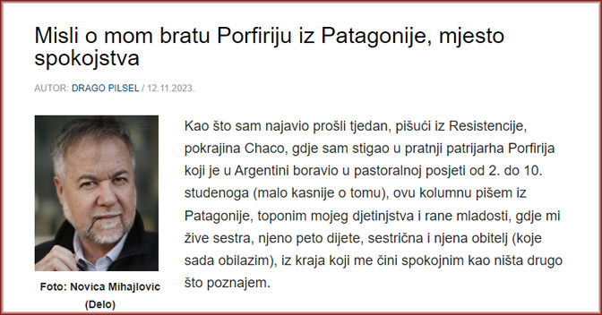 Ja, unuk jednog ustaše i jednog gestapovca, sin jednog od Pavelićevih ”momaka” u Buenos Airesu, jer odbacih ustaštvo i prigrlih antifašizam, u Argentini, malo kao vodič, malo kao prevoditelj, malo kao neformalni savjetnik, među Srbima i Crnogorcima, tiho, šapući sebi govorim da imam brata, da mi je Bog dao brata, da sam ga dobio darovanog u osobi Srbina rođenog u mjestu Bečej, u Vojvodini, sada na čelu Srpske Pravoslavne Crkve, jedne grane jedine Crkve Kristove (da to ekleziološko pitanje kažem kako ja osjećam) i da mi to bratstvo grije srce, da me to bratstvo obavezuje da se osjećam jedno s članovima Porfirijeve delegacije i vjernog naroda, da me ta svijest sada drži budnim u Patagoniji gdje si govorim da nam Branko, ipak, nije poginuo/nestao uzaludno.