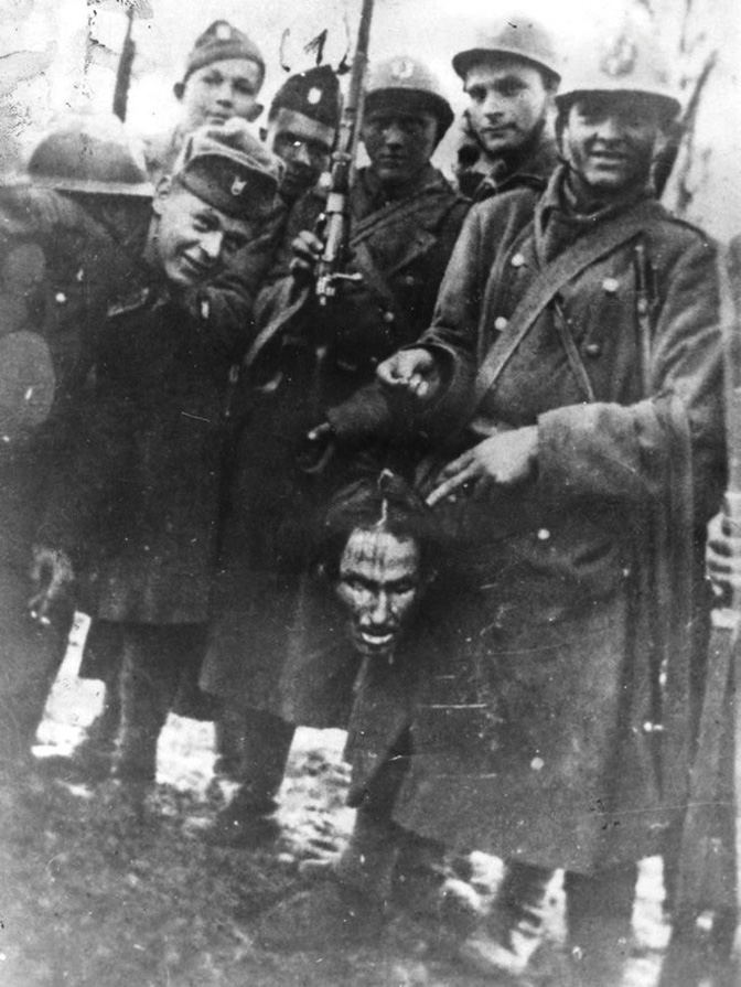 Усташе са одсеченом главом Јована Блаженовића из Дракулића (Извор: Печат)